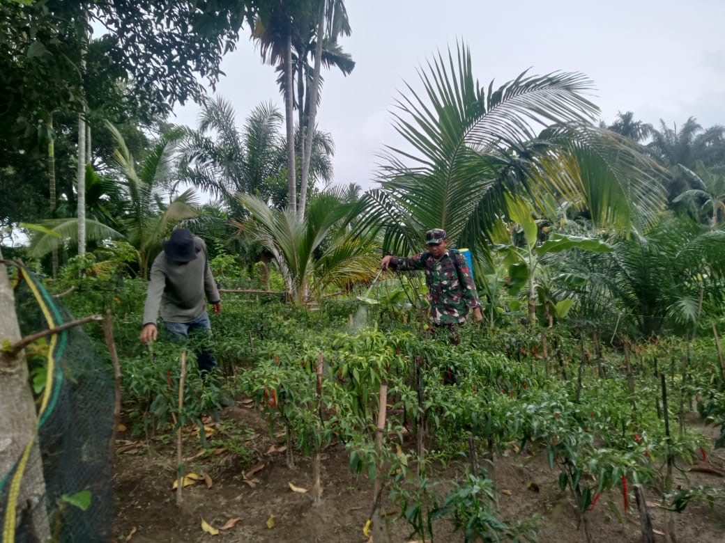 Abdya – Bintara Pembinaan Desa (Babinsa) Koramil 05/Tangan-Tangan Kodim 0110/Abdya Koptu Sadiman membantu warga binaannya melakukan penyemprotan cabe untuk merangsang…