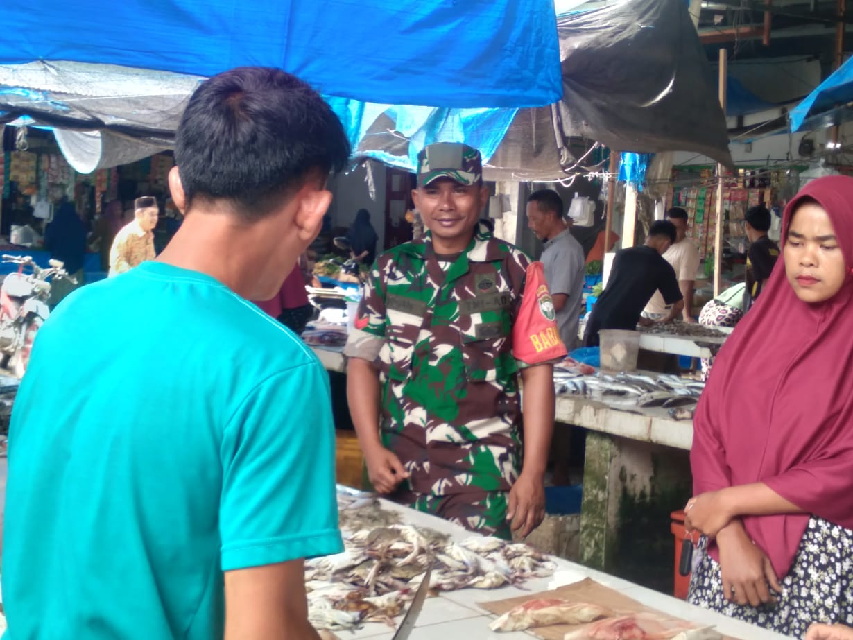Abdya- Babinsa Koramil 05/Tangan-Tangan Kodim 0110/Abdya Koptu Irsan Melaksanakan kegiatan Komunikasi sosial dengan penjual ikan di pasar tanjung bunga desa…