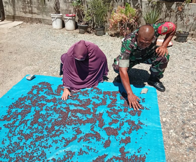 Abdya – Babinsa Koramil 03/Jeumpa Kodim 0110/Aceh Barat Daya Serka Aidi membantu warga desa binaannya, ibu Hafsah, menjemur kopi di…