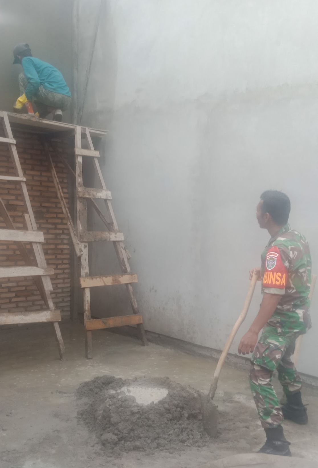Abdya – Babinsa Koramil 09/Lembah Sabil Sertu Yasir Arafat turun langsung membantu para tukang bangunan mengaduk semen dalam rangka pekerjaan…