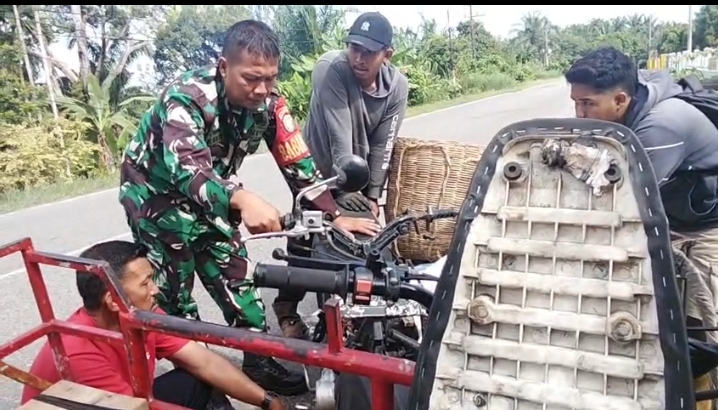 Seperti yang terlihat di Desa Pasar Kota Bahagia, Kecamatan Kuala Batee, Kabupaten Aceh Barat Daya, Serda Nursahid dengan sigap membantu seorang warga yang mengalami kendala sepeda motor mogok di jalan. Tanpa ragu, Babinsa tersebut turun langsung memberikan bantuan fisik dengan memperbaiki motor warga hingga dapat digunakan kembali.