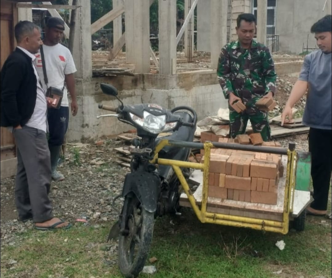 Babinsa melaksanakan karya bakti membantu warga mengangkut batu bata, kegiatan tersebut merupakan wujud kepedulian dan tanggung jawab Babinsa terhadap masyarakat di wilayah binaannya, dengan penuh semangat Serka Sukardi turun langsung membantu proses pembangunan rumah milik warga sebagai bentuk nyata kemanunggalan TNI bersama rakyat.