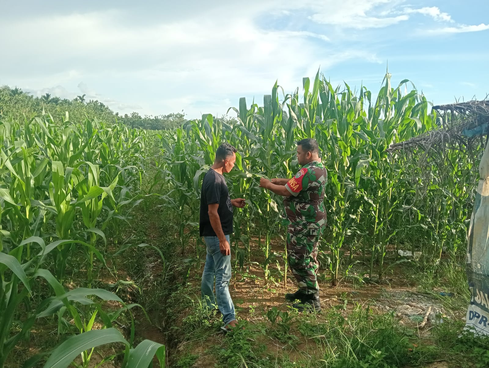 Dalam kegiatan tersebut, Koptu Iskandar berdialog langsung dengan petani sambil memeriksa kondisi tanaman jagung yang saat ini tumbuh subur. Ia juga memberikan motivasi serta arahan kepada petani terkait perawatan tanaman agar hasil panen nantinya dapat maksimal.