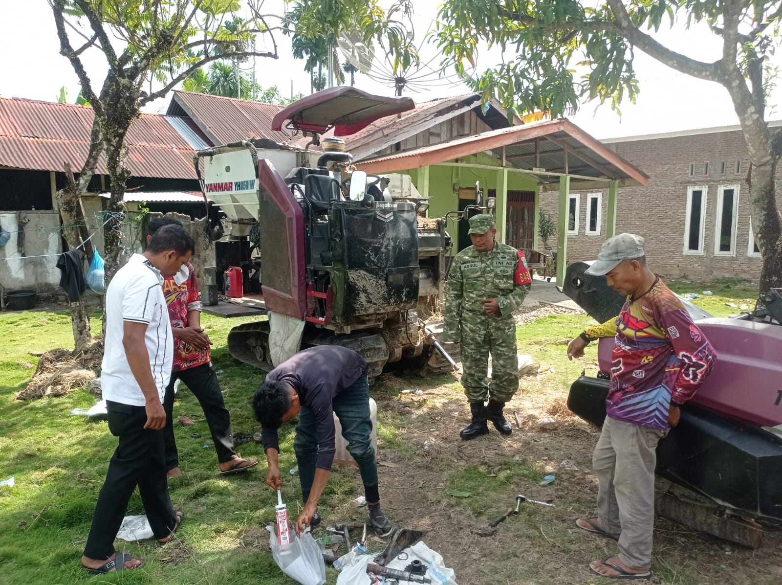 “Kegiatan panen padi petani kita telah selesai. Hari ini selagi libur kita lakukan servis traktor kombine sekaligus menginventarisir ulang Alsintan,” ungkapnya.