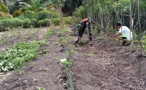 Abdya – Dalam rangka mendukung program pemerintah di bidang ketahanan pangan, Babinsa Koramil 02 Kuala Batee Kodim 0110/Abdya, Koptu Raitar, melaksanakan kegiatan humanis dengan membantu petani membersihkan kebun dan memanfaatkan lahan kosong di Desa Drien Berumbang, Kecamatan Kuala Batee, Kabupaten Aceh Barat Daya, Kamis (9/10/2025).
