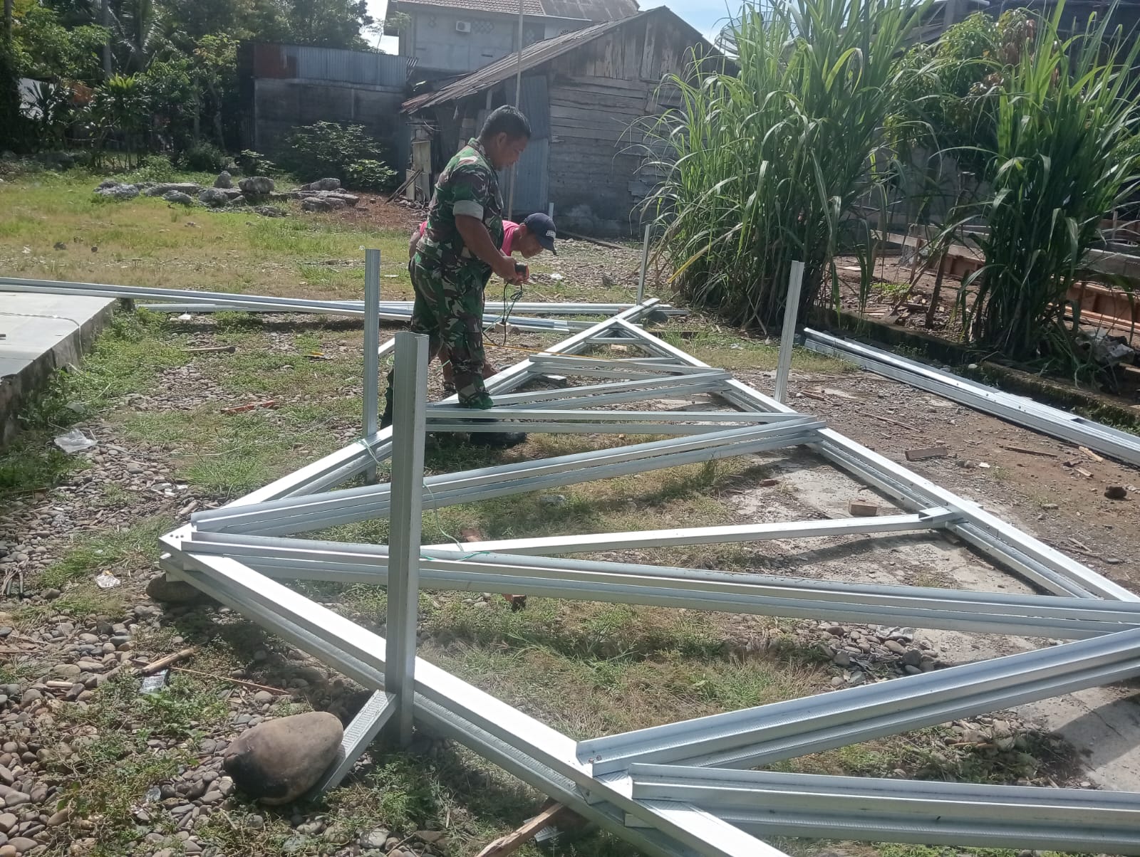 Pada kesempatan kali ini, Sertu Mimi Suwardi membantu bapak Ibrahim dalam Merakit besi untuk kelanjutan pembangunan atap rumahnya.