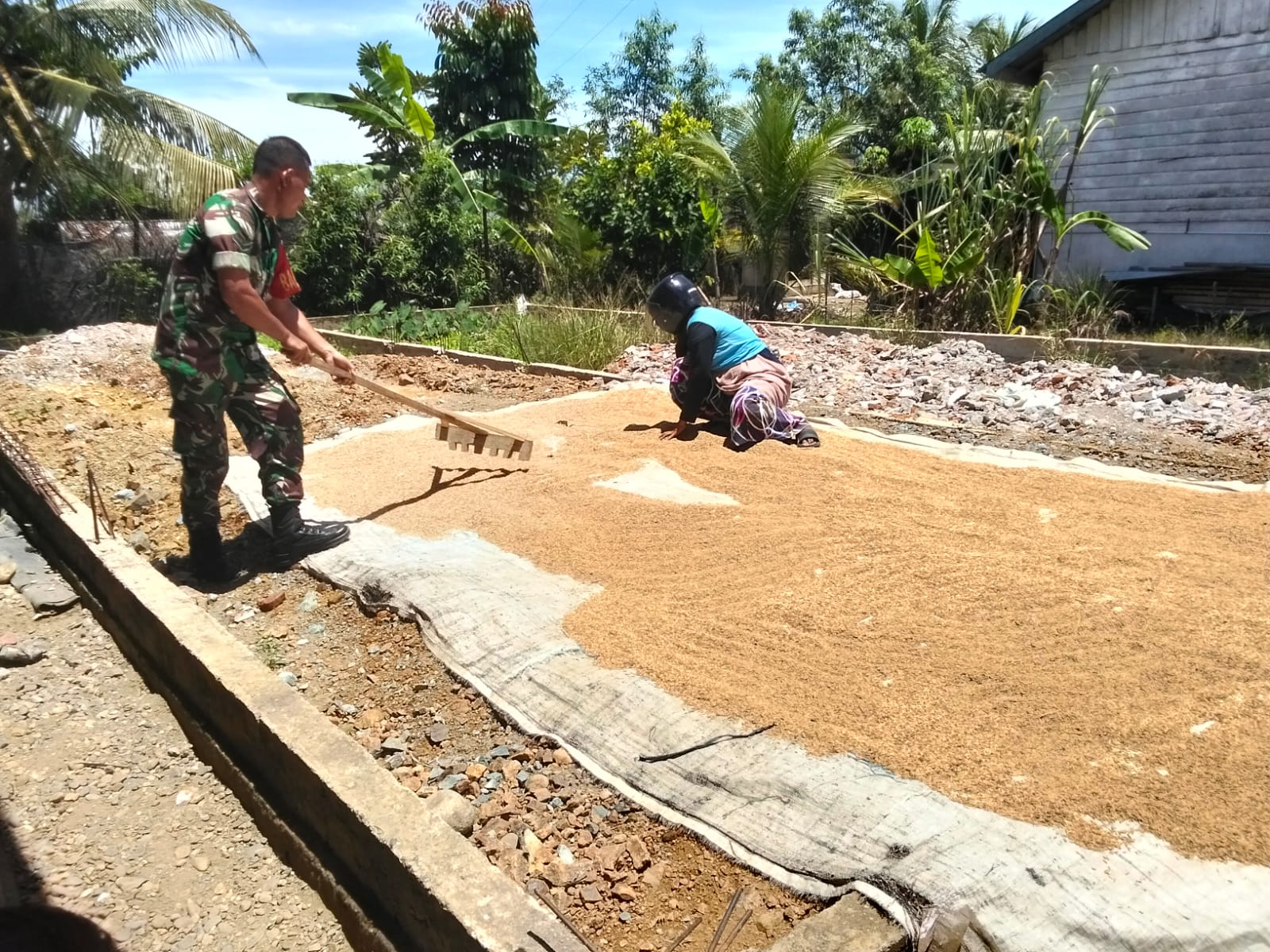 “Sebagai Babinsa, kami selalu hadir di tengah masyarakat, khususnya para petani, untuk memberikan motivasi dan bantuan langsung di lapangan. Penjemuran padi ini sangat penting agar gabah berkualitas dan harga jualnya meningkat,” ujarnya.