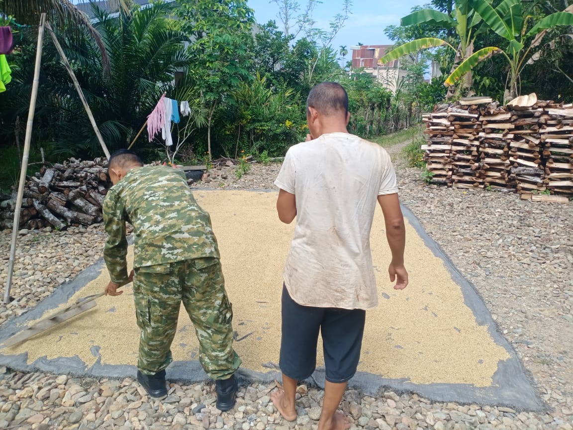 Sebagaimana dilakukan oleh Sertu Simson Perossa Selian yang ikut serta membantu petani warga desa binaannya, saat melakukan penjemuran padi.