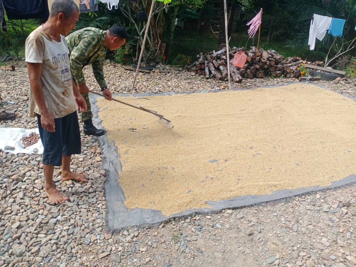 Sertu Simson Perossa Selian dan juga Serda Tahwil Hayat yang ikut serta membantu petani warga desa binaannya, saat melakukan penjemuran padi. “Kami akan selalu mengawal dan mendampingi para petani sehingga betul-betul merasakan, dengan hadirnya Babinsa di tengah-tengah mereka, akan terus bersinergi bersama para petani untuk mendukung program pemerintah dalam swasembada pangan”, tutur Sertu Perrosa.