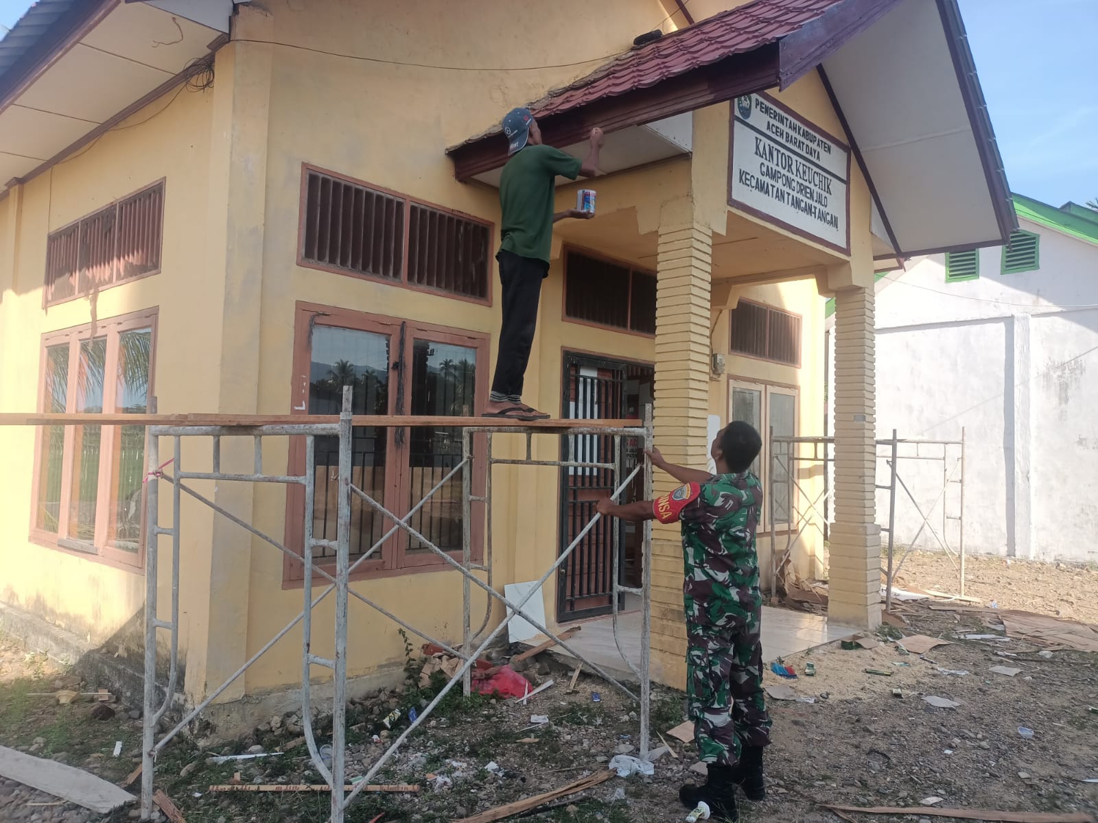 Abdya – Babinsa Koramil 05/Tangan-Tangan Serda Hamdani mendampingi pekerja perenovasian Kantor Keuchik/Kepala Desa di Desa Drien Jalo, Kecamatan Tangan-Tangan, Kabupaten Abdya, Rabu (28/1/2026)