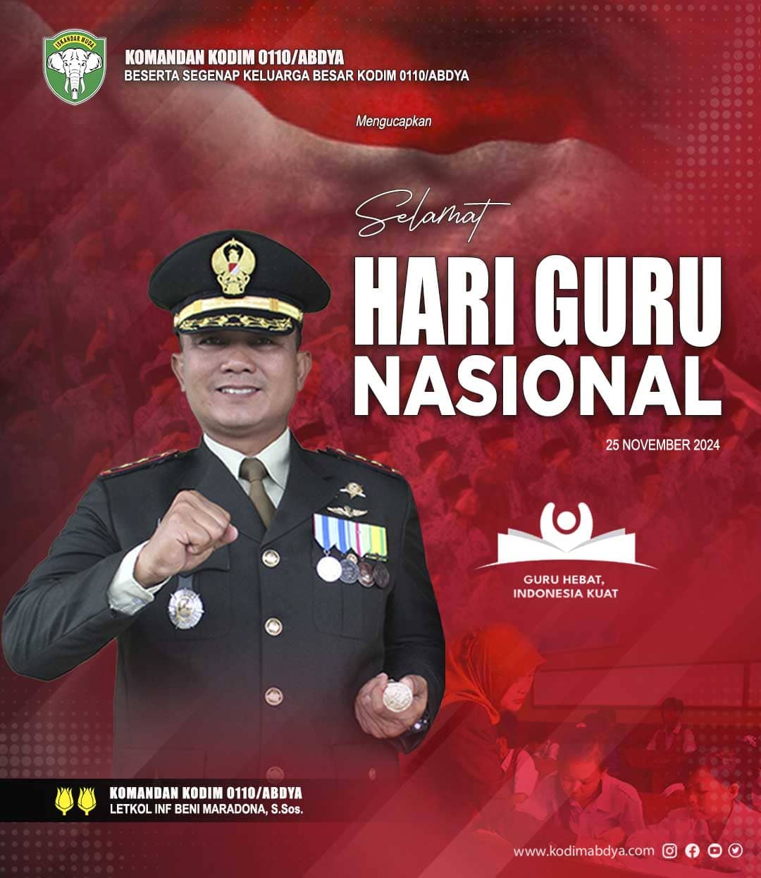 Komandan Kodim 0110/Abdya Letkol Inf Beni Maradona, S.Sos beserta segenap keluarga besar Kodim 0110/Abdya mengucapkan Selamat Hari Guru Nasional TA…