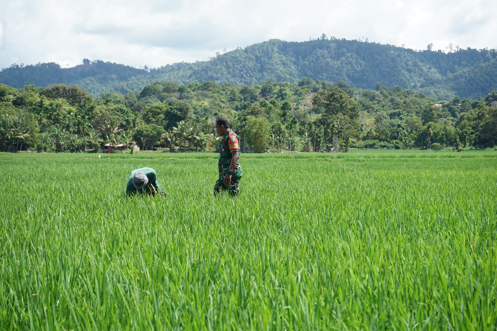 Abdya – Babinsa Koramil 01/Blangpidie Serda Iwan Setiawan dampingi petani bersihkan rumput di sawah, di Desa Cot Jeurat, Kecamatan Blangpidie,…