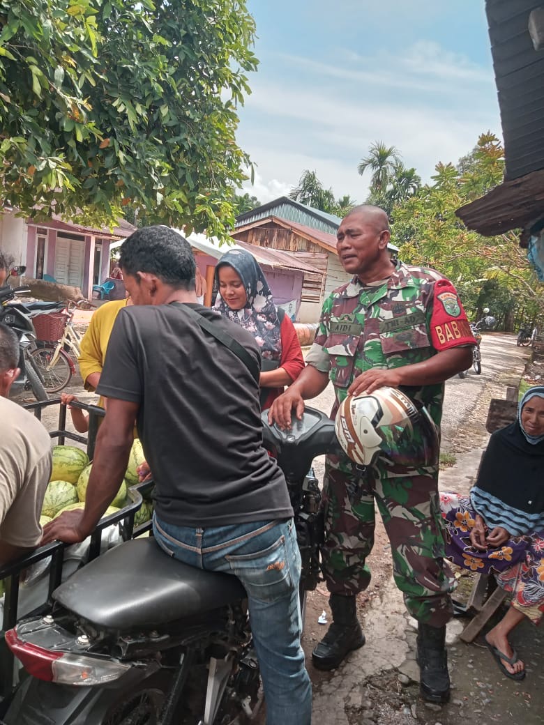 Abdya – Babinsa Koramil 03/Jeumpa Kodim 0110/Abdya Serka Aidi melaksanakan Komsos dengan pedagang buah keliling yang ada di Desa Kuta…