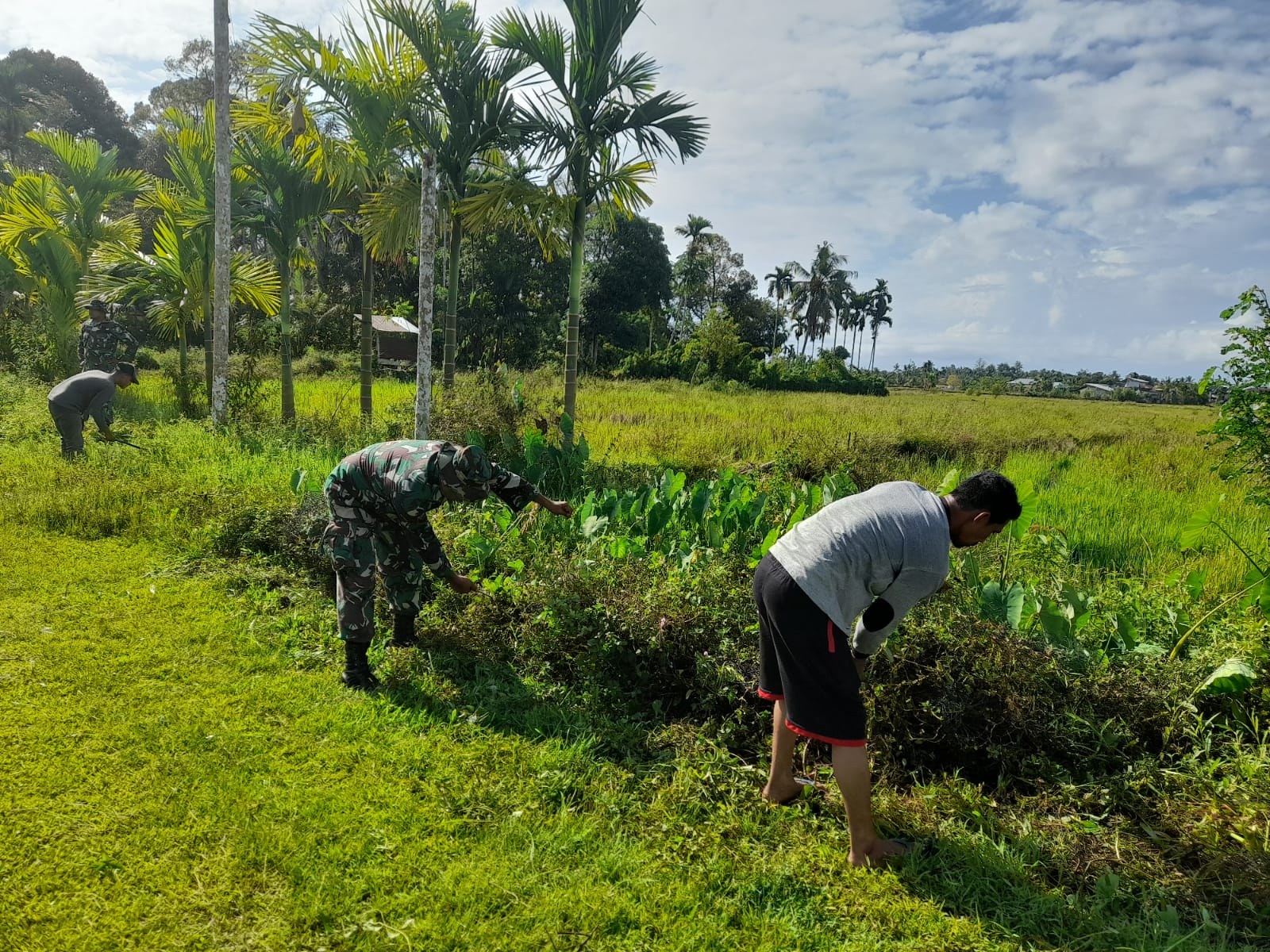Abdya – Serka Musmulyadi, Babinsa Koramil 03/Jeumpa, Kodim 0110/Abdya membantu warga dalam kegiatan gotong royong membersihkan semak-semak di pinggiran desa…