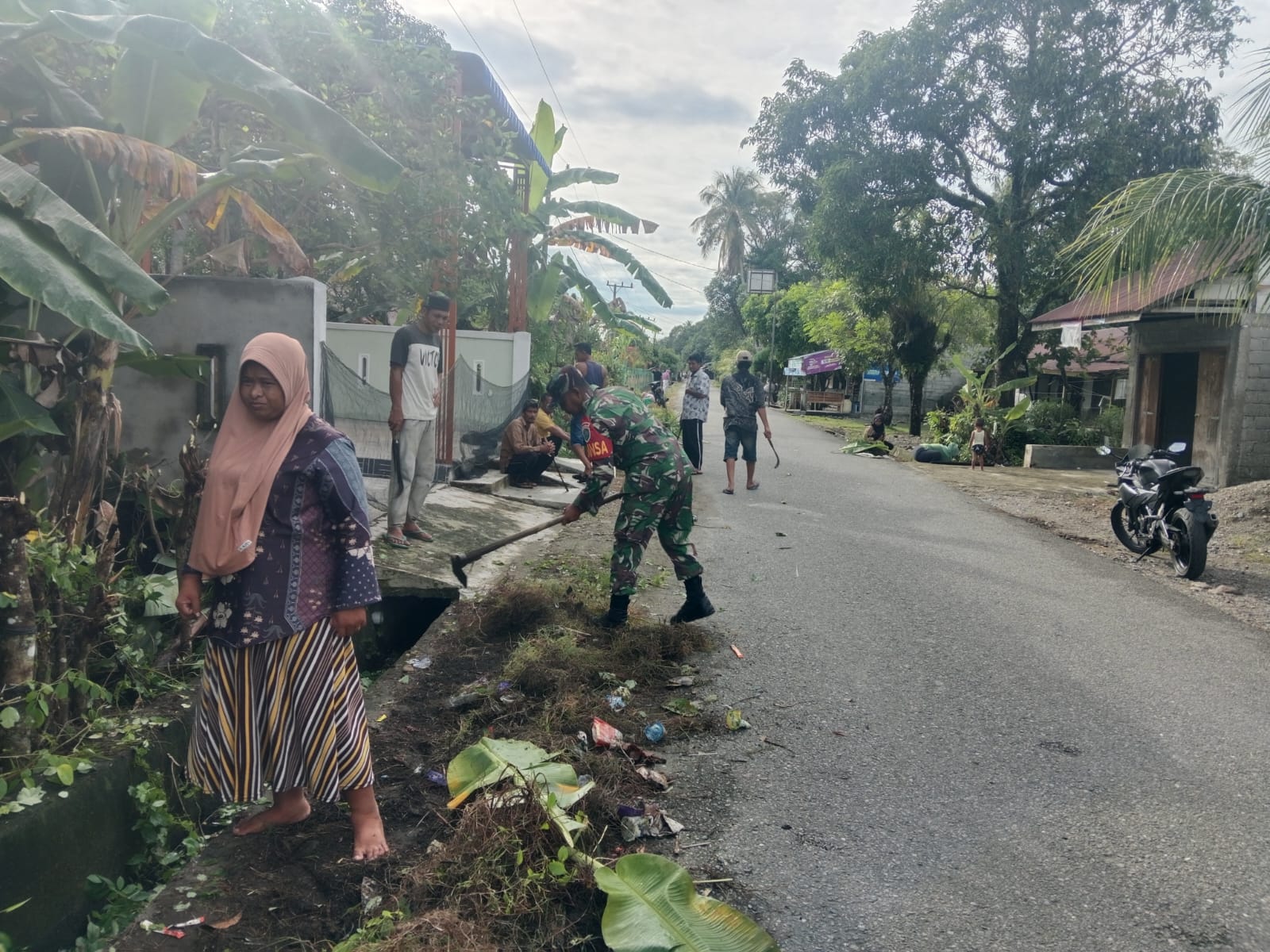 Abdya – Babinsa Koramil 06/Manggeng, Serda Jeli Ananda, bersama perangkat Kelurahan Sejahtera dan warga setempat menggelar kegiatan gotong royong membersihkan…