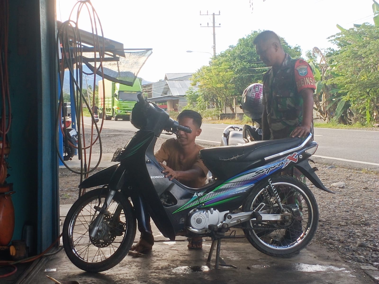 Abdya, Babinsa Koramil 09/Lembah Sabil Kodim 0110/Abdya Sertu Turohmat di sela waktu melaksanakan kegiatan Produktif dgn usaha Bengkel Sepeda motor dengan warga binaan Pak Ahmad di Desa Alu Rambut, Kecamatan Lembah Sabil, Kabupaten Abdya, Minggu (1/3/2026)