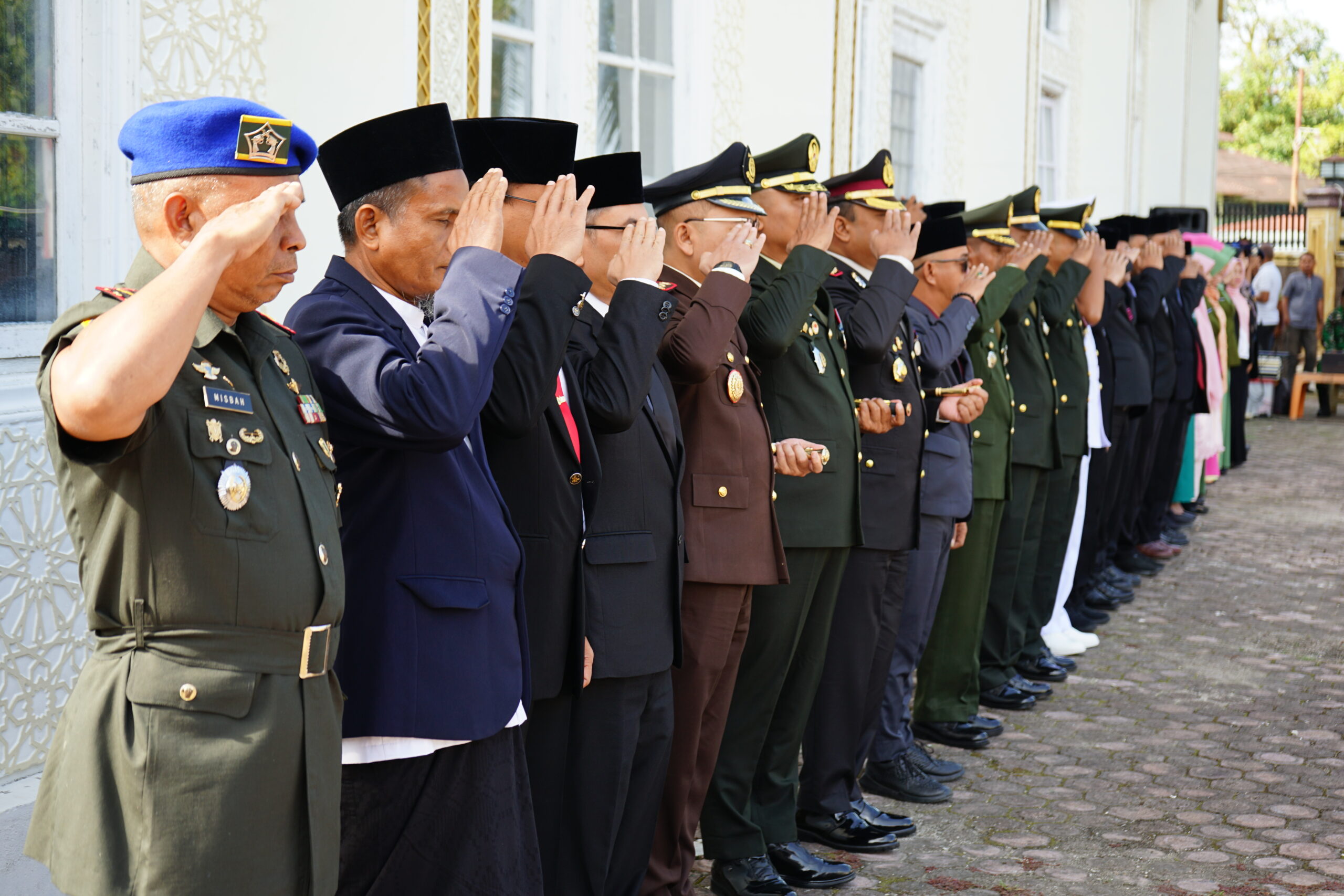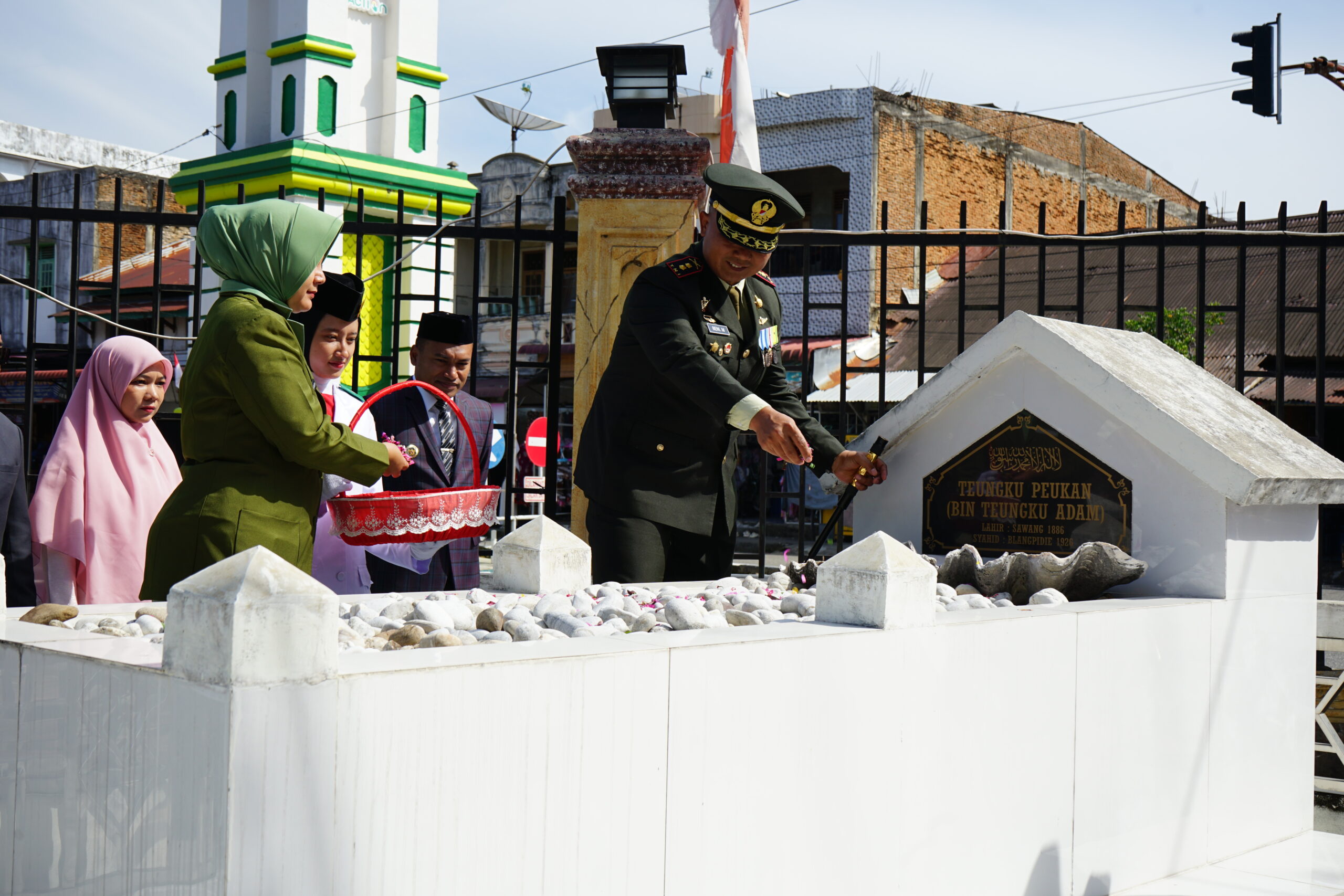 Abdya –  Komandan Kodim (Dandim) 0110/Abdya Letkol Inf Beni Maradona, S.Sos bersama jajaran Forum Koordinasi Pimpinan Daerah (Forkopimda) mengikuti upacara ziarah ke makam pahlawan Tengku Peukan di Kompleks Masjid Jamik Baitul Adhim, Desa Pasar, Kecamatan Blangpidie, Sabtu (16/8/2025) pagi.