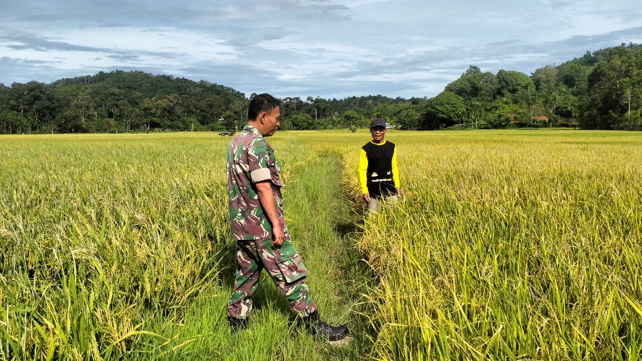 Padi dilahan tersebut tampak mulai menguning dan menandakan masa panen akan segera tiba, kehadiran Babinsa di lapangan sekaligus memberi semangat kepada petani agar tetap optimis menghadapi musim panen.