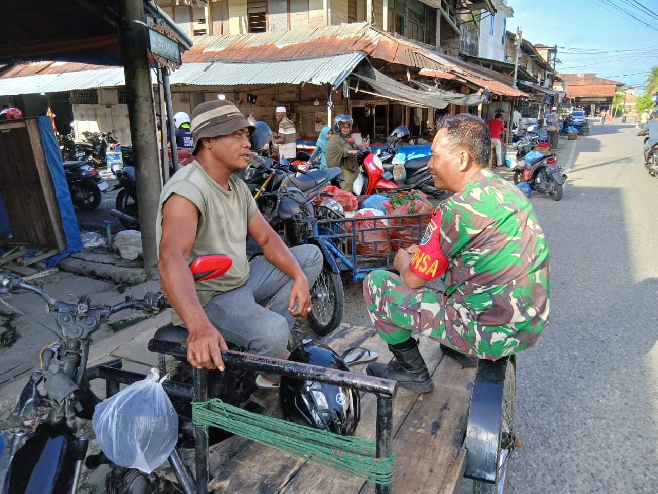 Abdya – Babinsa Koramil 01/Blangpidie Kodim 0110/ Abdya Serda Dapit Cristian melaksanakan komsos dengan tukang becak di Desa Meudang Ara, Kecamatan Blangpidie, Kabupaten Abdya, Rabu (31/12/2025)
