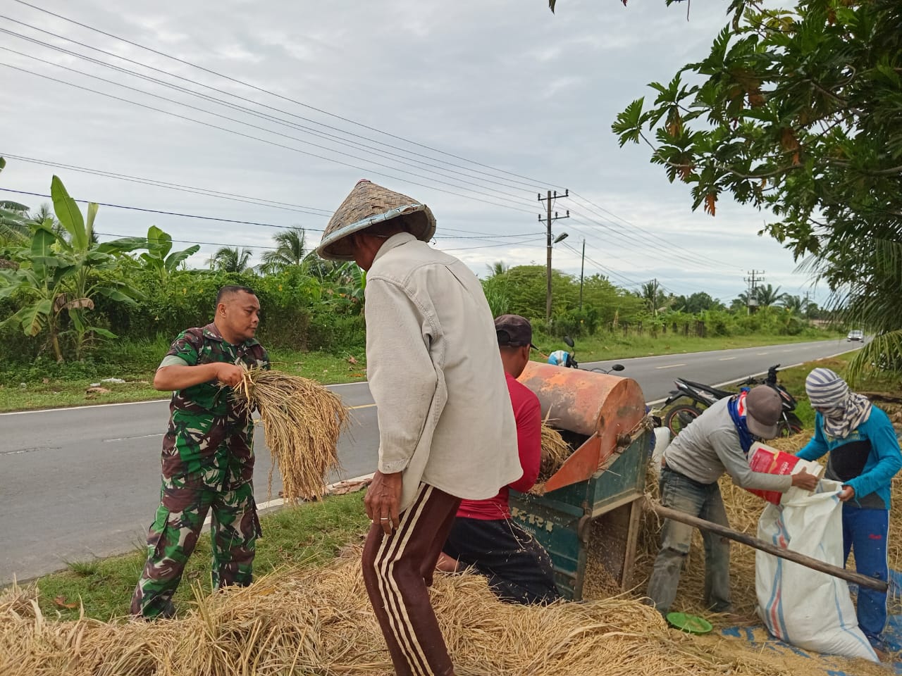 Abdya – Guna meningkatkan hasil pertanian sehingga mewujudkan ketahanan pangan di wilayah, seperti yang dilakukan Babinsa Koramil 03/Jeumpa Serda Mulyadi, membantu petani memanen padi Di Desa Iku Lhung, Kecamatan Jeumpa, Kabupaten Aceh Barat Daya, Minggu (14/9/2025).