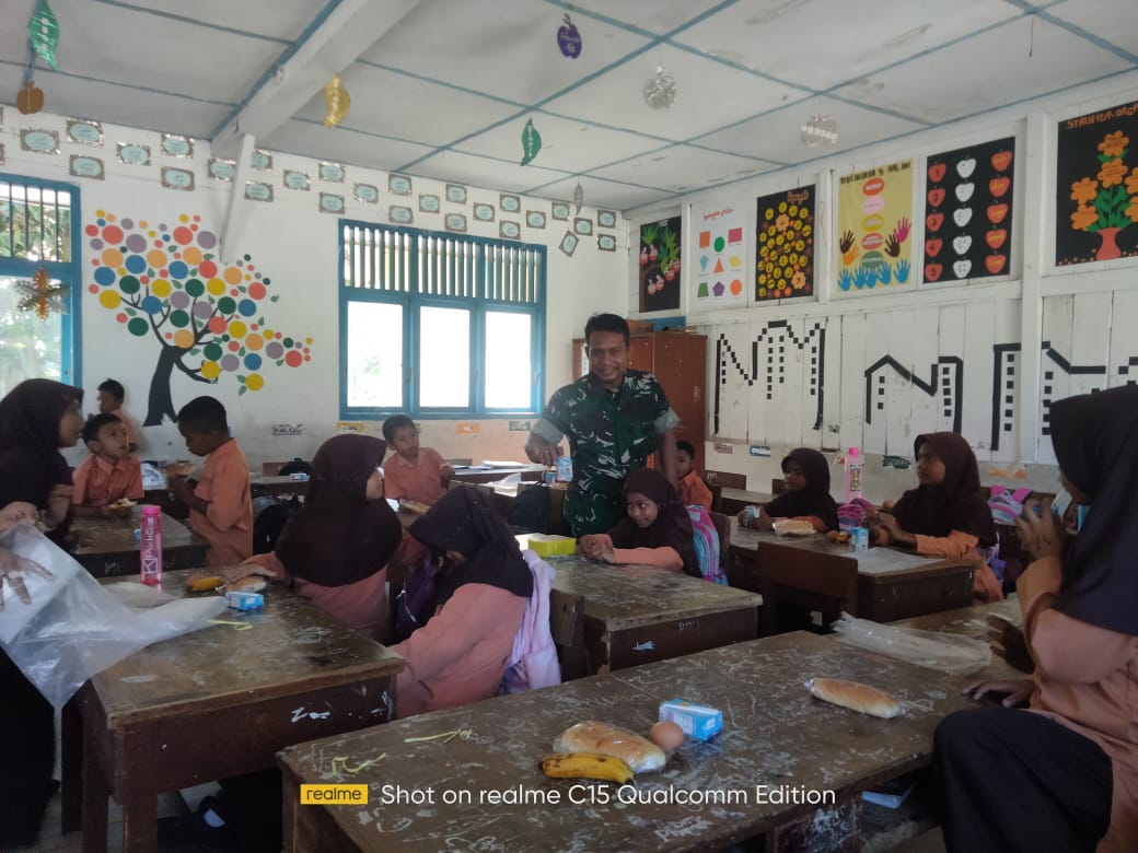 Dalam pelaksanaan kegiatan tersebut, Serda Sukimin terlihat aktif memastikan seluruh tahapan penyajian dan pembagian makanan berlangsung dengan baik, mulai dari proses pendistribusian, kebersihan makanan, hingga keteraturan siswa saat menerima hidangan. Ia juga memberikan imbauan kepada para siswa untuk selalu menjaga kebersihan diri dan membiasakan mengonsumsi makanan sehat sejak usia dini.