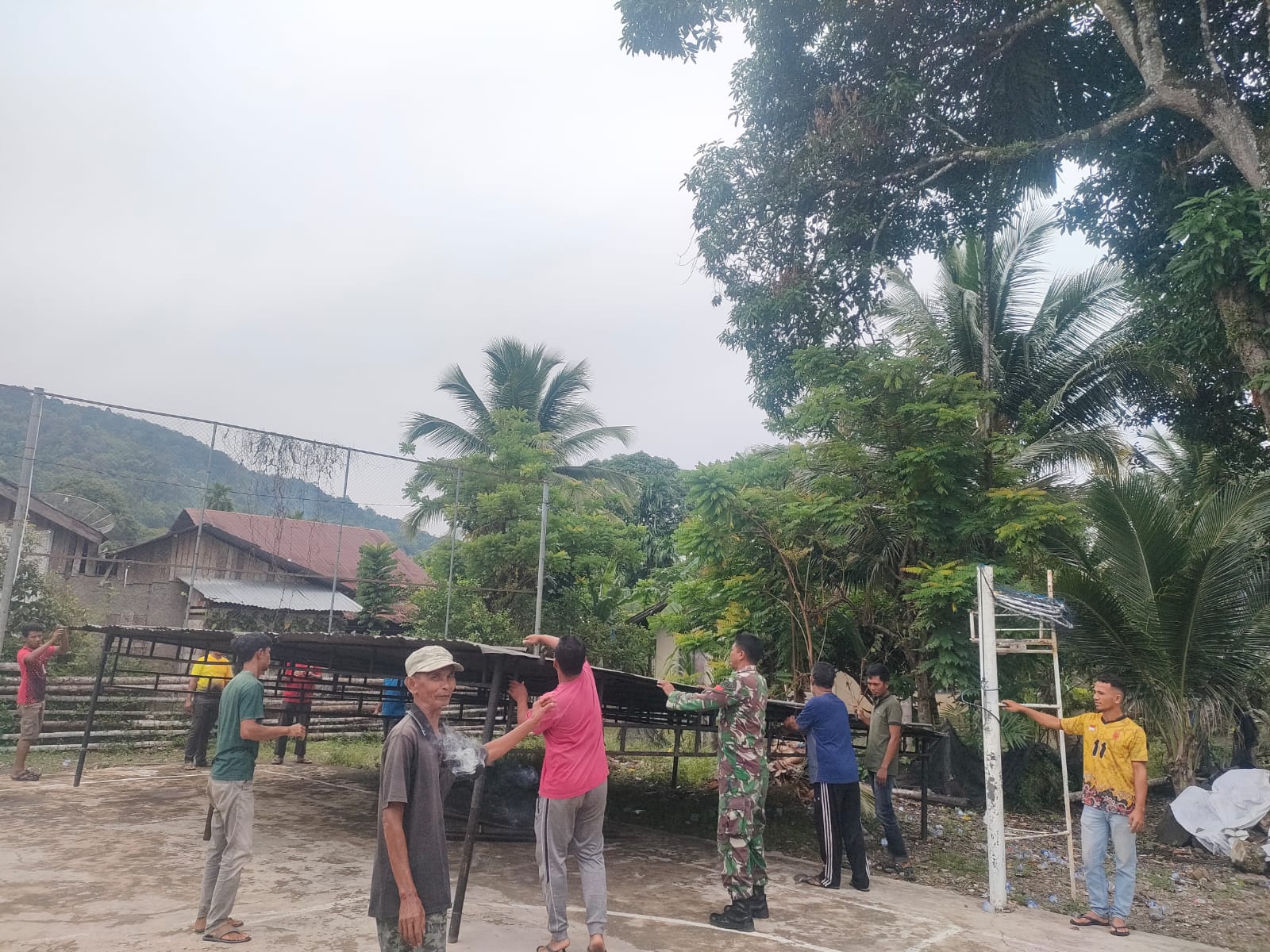 Solidaritas Babinsa Koramil 02/Kuala Batee Gotong Royong Pasang Tenda Acara Syukuran Di Rumah Salah Satu Warga Binaan
