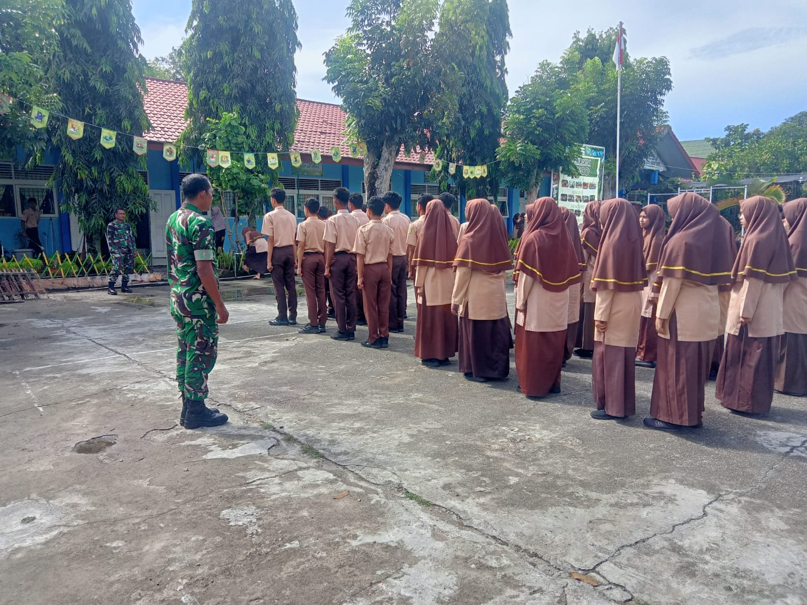 Abdya – Babinsa Koramil 01/Blangpidie Serda Iwan Setiawan memberikan latihan baris berbaris kepada siswa MAN Blangpidie di Desa Meudang Ara, Kecamatan Blangpidie, Kabupaten Abdya, Sabtu (14/2/2026)
