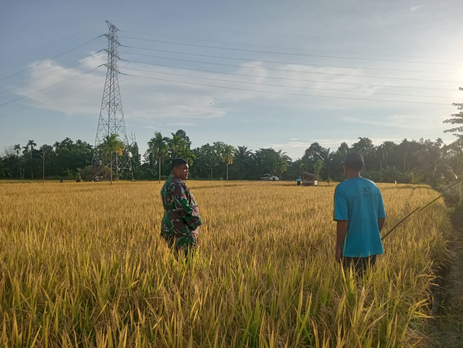 Abdya – Babinsa Koramil 07/Babahrot Kodim 0110/Abdya Serma Novriyandi monitoring kegiatan panen padi di pesawahan Desa Gunung Samarinda Kecamatan Babahrot, Minggu (28/9/2025).