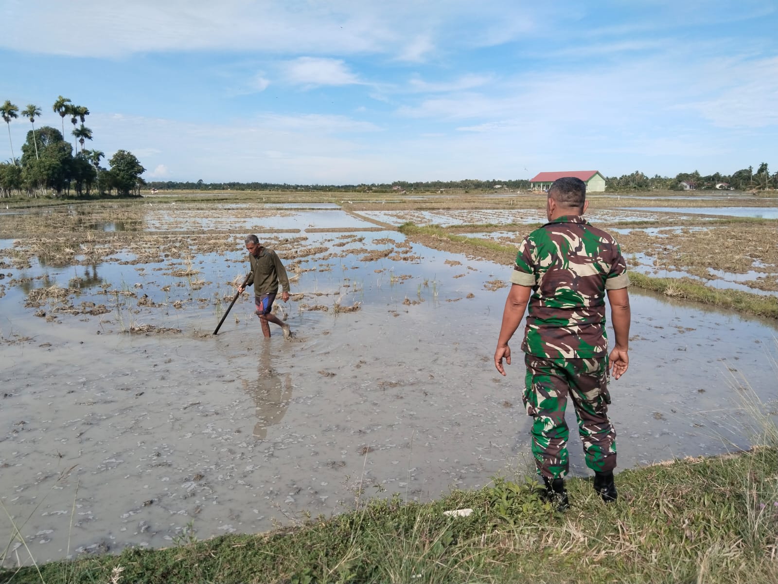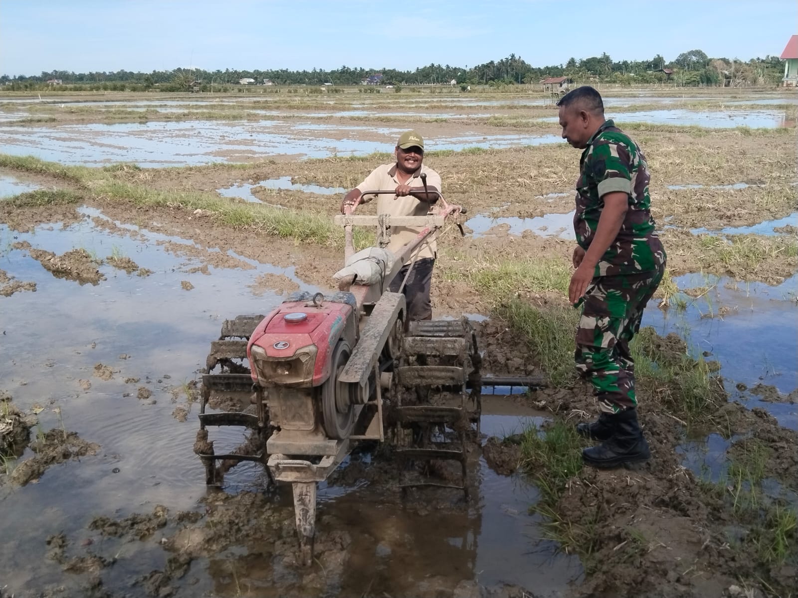 Abdya –  Babinsa Koramil 04/Susoh Kodim 0110/Abdya Serda Nasir mendampingi para petani binaan kegiatan pembajakan sawah di Desa Gadang, Kecamatan Susoh, Senin (24/11/2025).